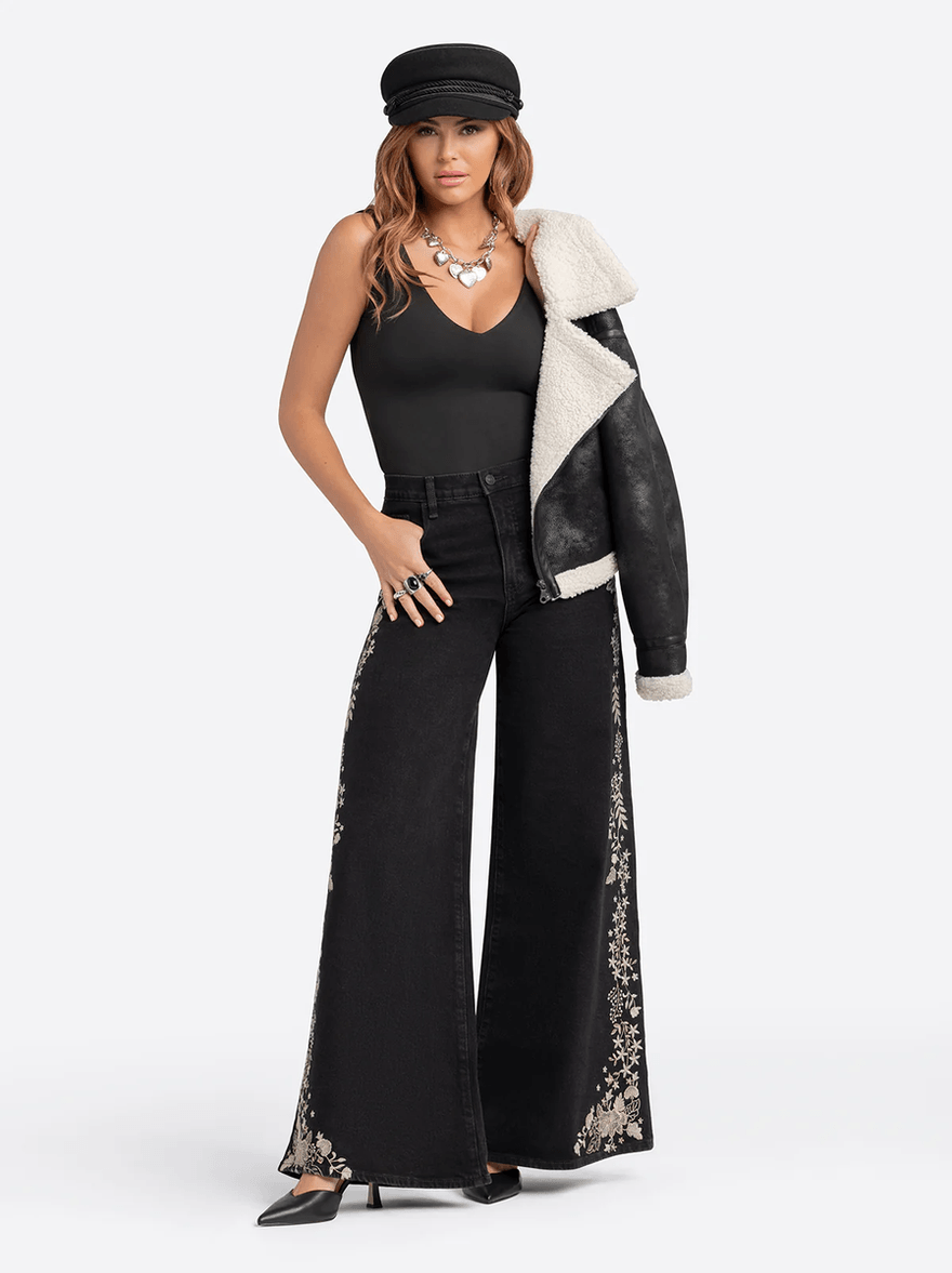 The Jessica Simpson 2.0 Joplin Super Wide Jeans in Black feature stunning embroidery cascading down the sides, ensuring you stand out wherever you go. With a comfortable 32.5-inch inseam, these jeans move with you, providing a fit that feels as good as it looks. Whether you’re enjoying a day out with friends or heading to an evening event, these flares adapt to your style, making you the main character in any setting.