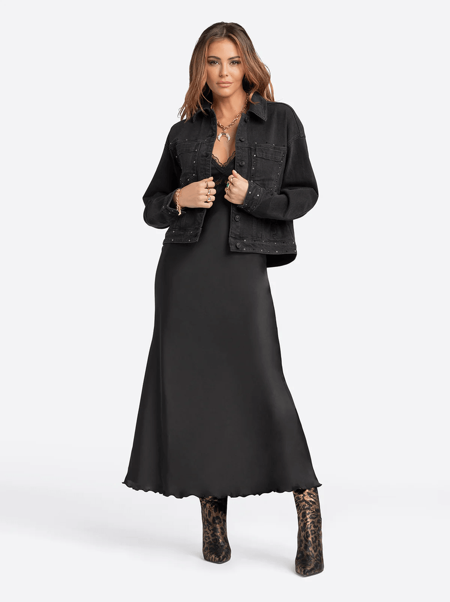 The Jessica Simpson 2.0 Trucker Jacket in Luminous redefines casual elegance with its innovative design. The classic button-front closure and practical flap chest pockets offer both style and utility. Its sleek seam detailing not only enhances the silhouette but also provides a contemporary twist to this timeless piece. The bold stud accents ensure that this jacket stands out, allowing you to express your unique style effortlessly.