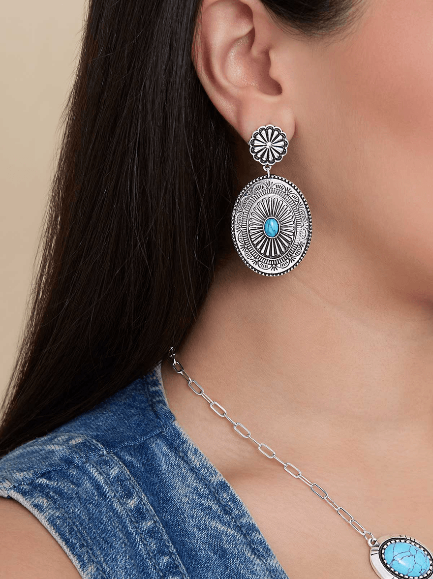 Transform your accessory collection with the exquisite Jessica Simpson Boho Chic Earrings Silver. These stunning earrings feature intricate mandala-inspired designs, perfectly blending traditional artistry with modern bohemian flair. The radiant turquoise stone at the center adds a vibrant pop of color, making these earrings a must-have for any fashion-forward individual.