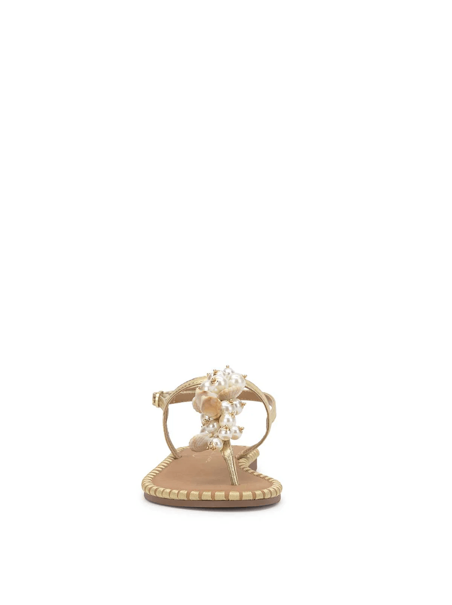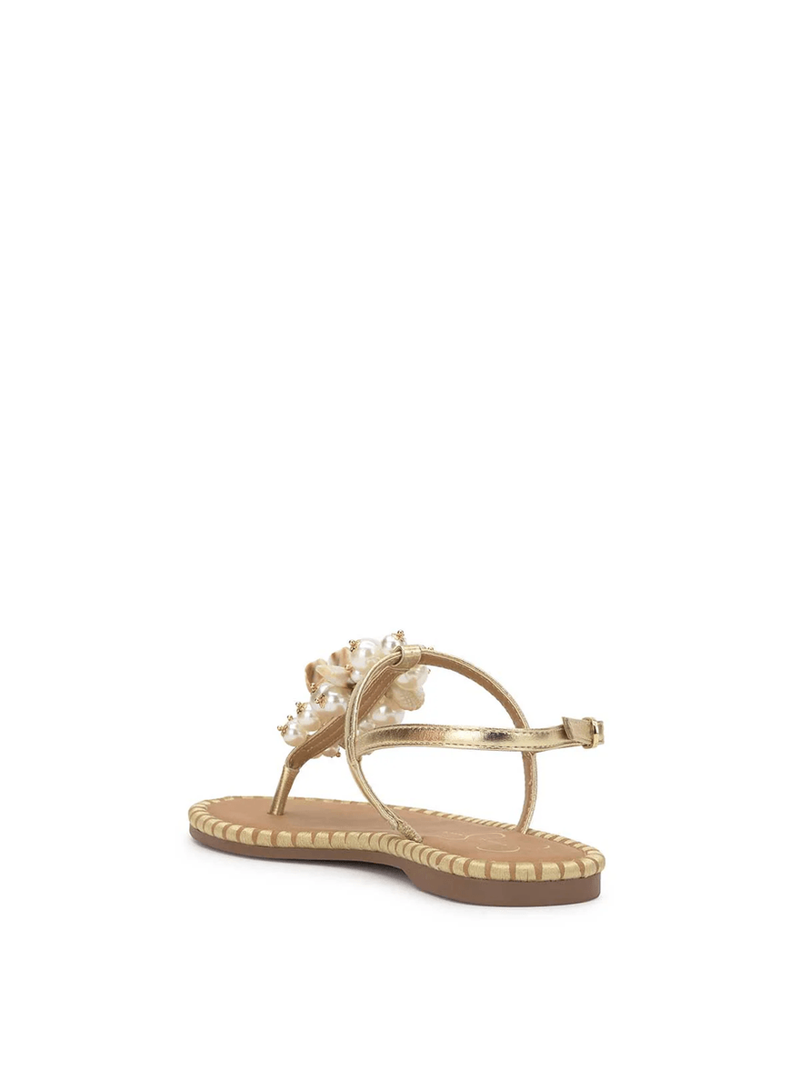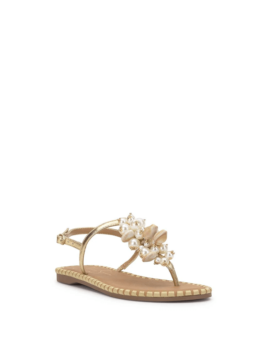 The Jessica Simpson Bryelea Sandal in Gold features a trendy t-strap design adorned with elegant pearls, providing a sophisticated touch to your look. Whether you're dressing up for a summer wedding or enjoying a day out with friends, these sandals seamlessly blend style and practicality. Their lightweight construction ensures you stay comfortable while making a fashionable statement.