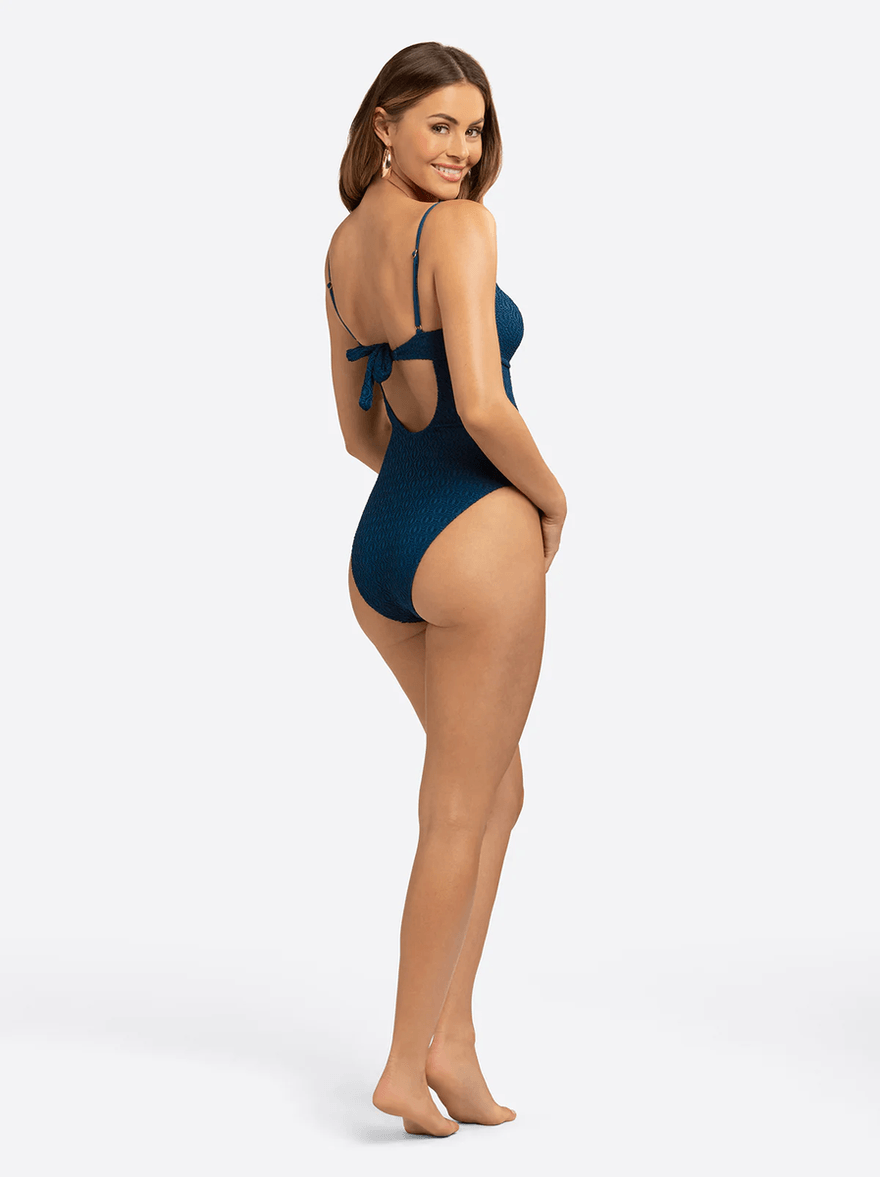Elevate your swimwear collection with the Jessica Simpson Crochet Ring Bandeau One Piece in Dark Denim. This stunning one-piece swimsuit combines sleek lines with a sultry design, making it the ultimate choice for poolside glamour and beach adventures.
