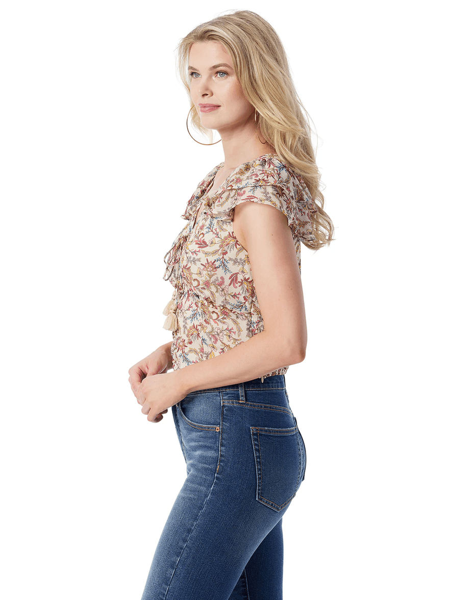 Discover the perfect blend of comfort and chic with the Jessica Simpson Dixie Cropped Blouse in Cartoon Florals. This stunning short sleeve blouse is designed to make a statement while keeping you effortlessly stylish for any occasion.