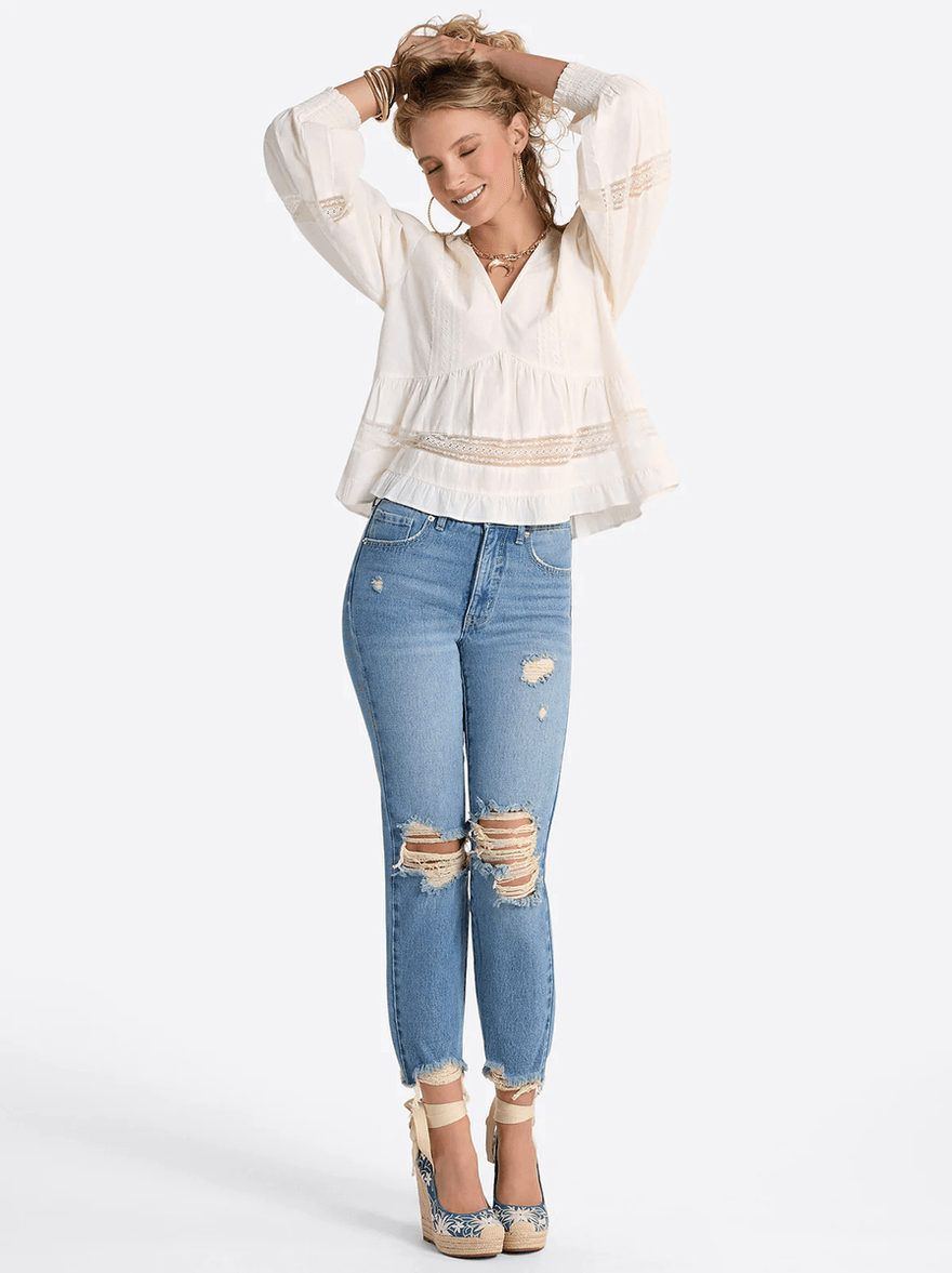 Discover the Jessica Simpson Elsie Babydoll Blouse in Buttercream