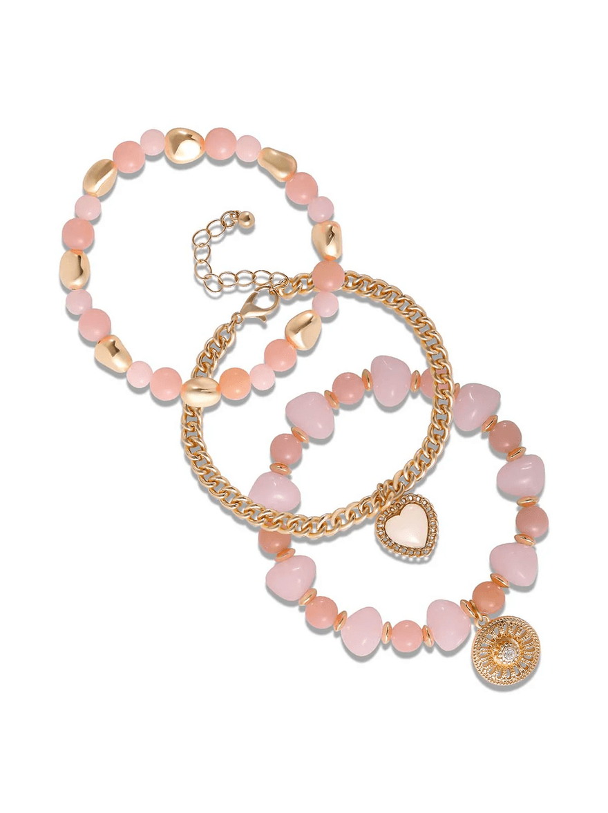 The Jessica Simpson Gold & Pink Beaded Bracelet Set features a delightful mix of designs. One bracelet showcases a bold gold chain adorned with a charming heart, while the other two bracelets include stretch bead designs embellished with teardrop shapes. The addition of a shimmering medallion charm adds a touch of glamour, making these bracelets perfect for day or night.
