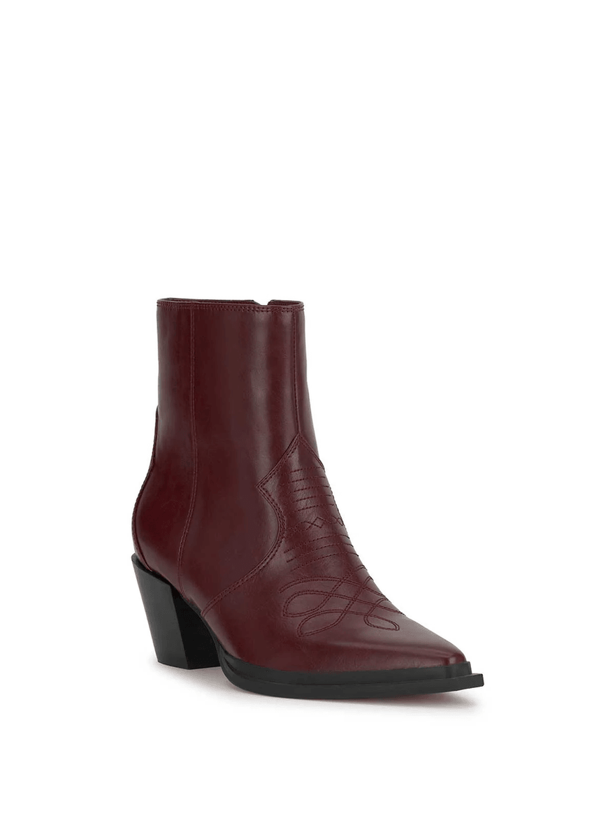 Elevate your footwear collection with the Jessica Simpson Helvona Western Bootie in Dark Granada. This stunning ankle bootie combines chic western aesthetics with modern comfort, making it the perfect choice for any occasion.