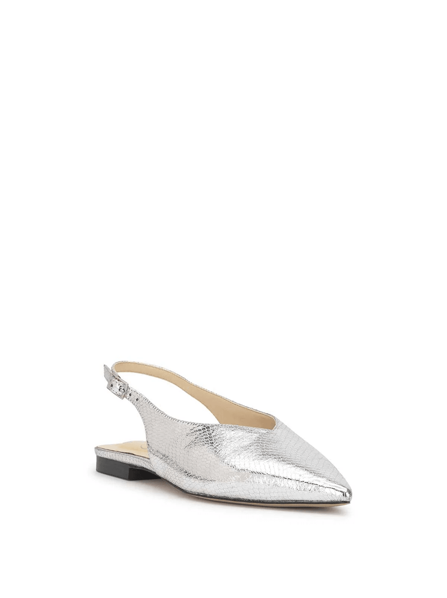 Elevate your everyday look with the Jessica Simpson Mezzah Flat in Silver. This chic pointed-toe slingback flat adds a fierce and fashionable flair to any outfit, making it the perfect choice for the modern woman on the go.