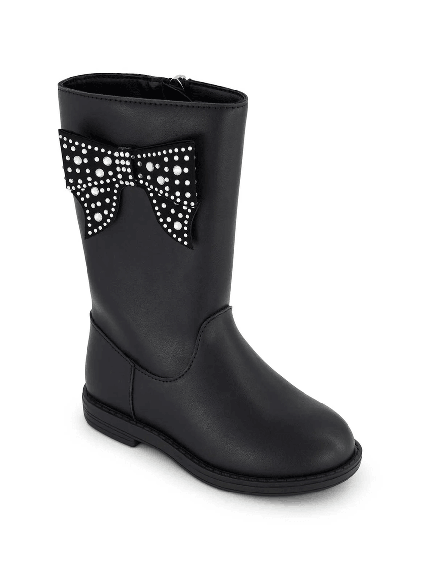 The Jessica Simpson Toddler Evie Ribbon Boot in Black is designed to keep your toddler both stylish and safe. The combination of a tall boot silhouette and an oversized decorative bow makes these boots a standout piece in any child's wardrobe. With a robust nonskid rubber outsole, your child can explore their surroundings confidently.