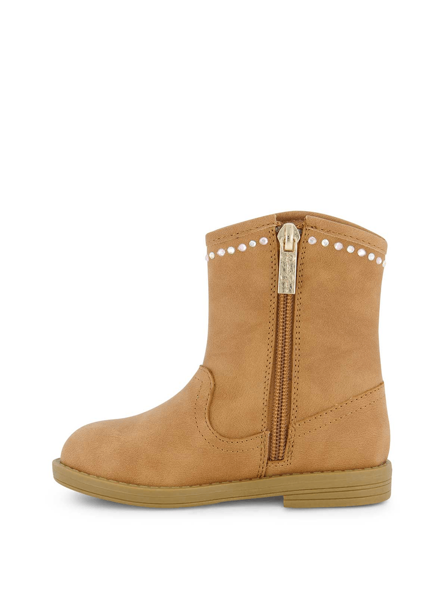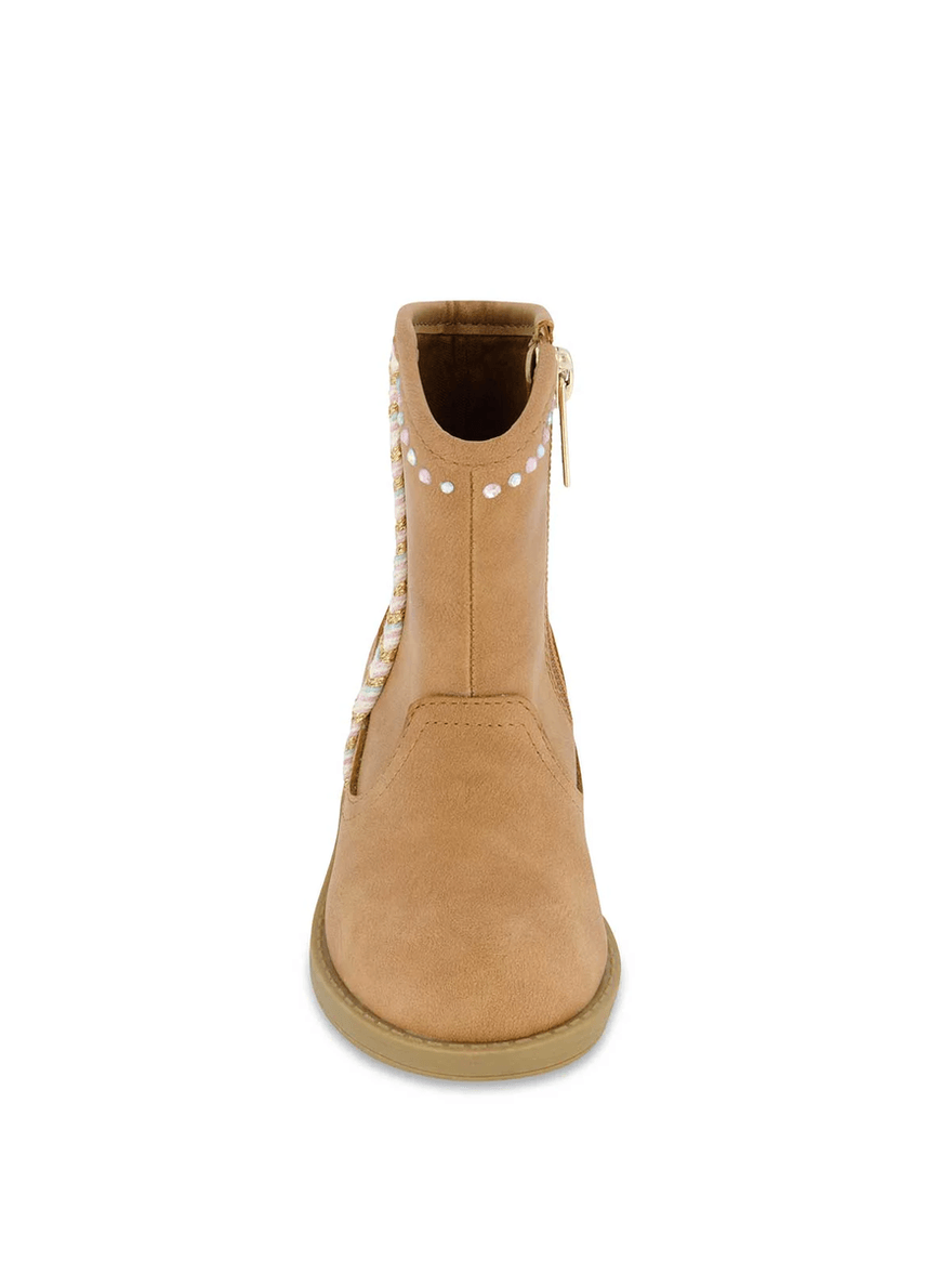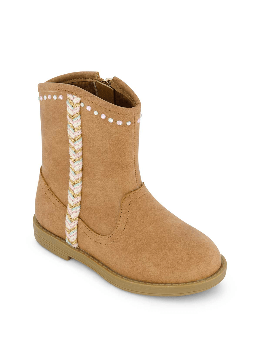 The Jessica Simpson Toddler Layla Stripe Western Bootie in Cognac is crafted for both style and durability. Ideal for playdates, family outings, or simply strutting around the house, these booties are versatile enough to complement any outfit. The midshaft design adds a fashionable touch while ensuring a snug fit to keep little feet secure.