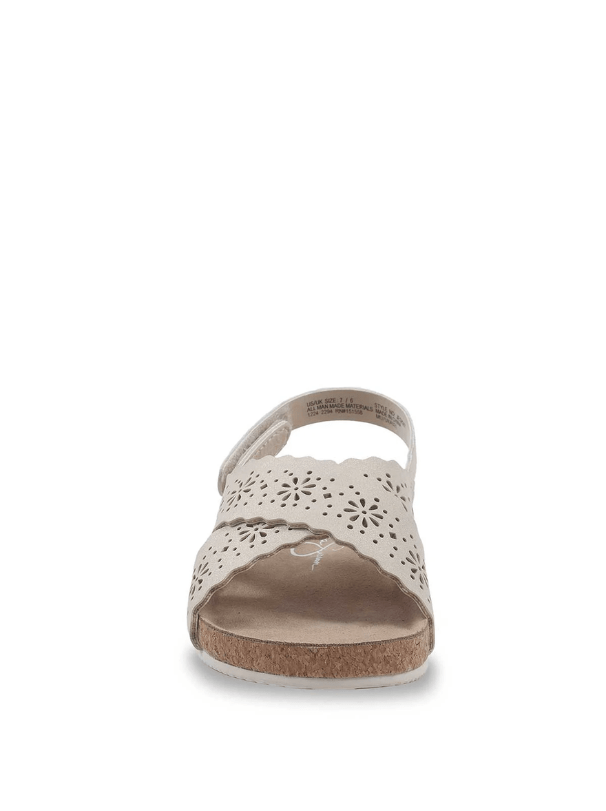 The Jessica Simpson Toddler Tamara Harlow Sandals boast a beautiful beige or off-white upper that pairs effortlessly with any outfit. The decorative cut-out flowers add a touch of whimsy, making these sandals a delightful choice for any toddler. Designed with comfort in mind, the sandals feature a cushioned footbed and a cork wrap that provides both style and durability.