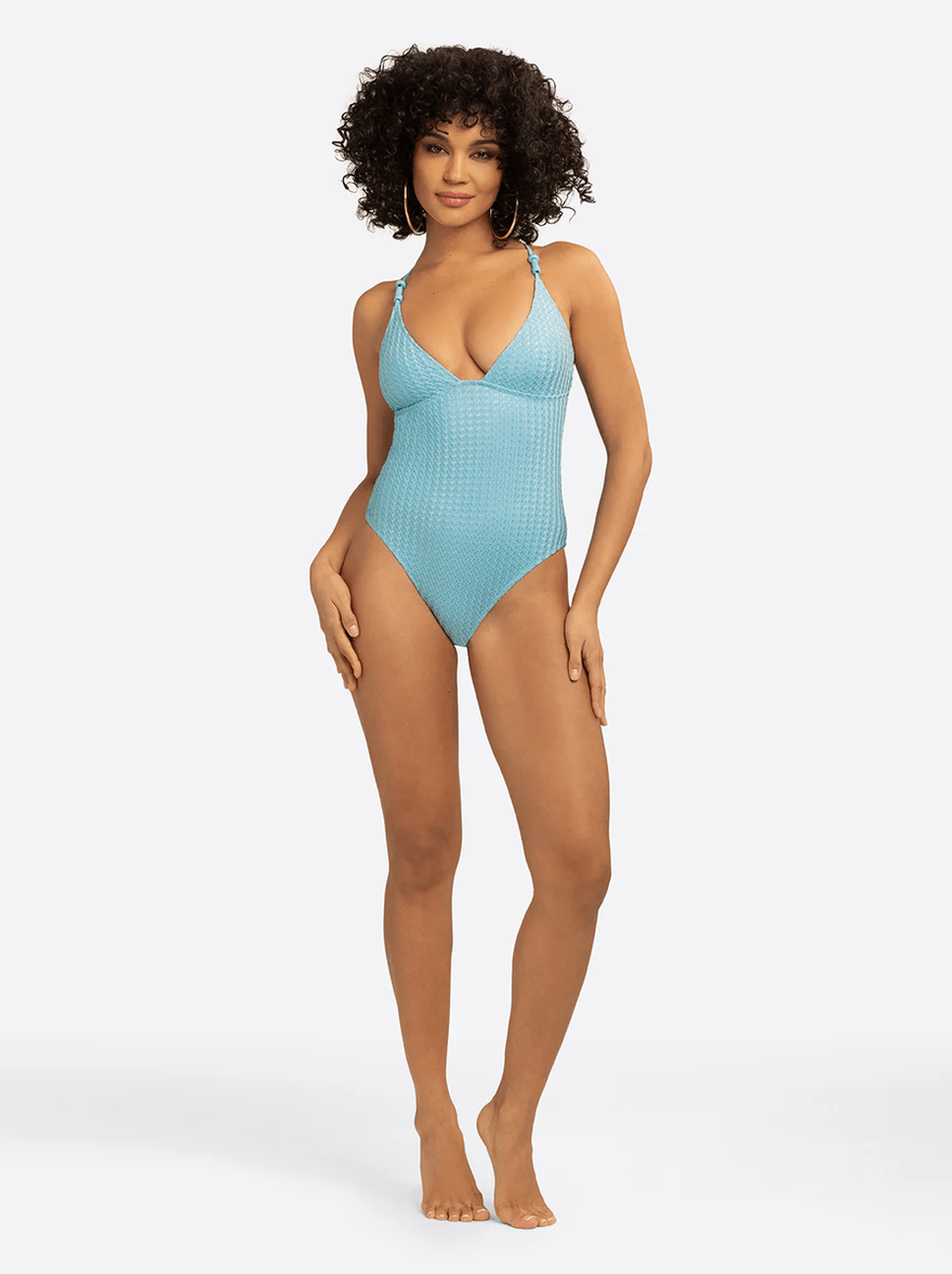Discover the ultimate blend of style and confidence with the Jessica Simpson Twisted Jacquard Classic One Piece in Blue Retro. This stunning swimsuit is designed for those who want to make a splash while looking effortlessly chic. Featuring a plunging V neckline and delicate spaghetti straps, this one-piece is a must-have for your summer wardrobe.